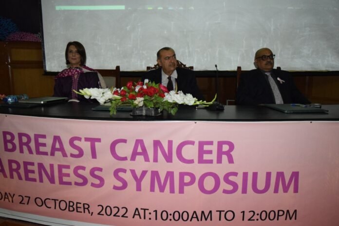 یونیورسٹی آف ہیلتھ سائنسز میں چھاتی کے سرطان کے حوالے سے آگاہی سمپوزیم کا انعقاد کیا گیا۔سمپوزیم کا انعقاد یو ایچ ایس میڈیکل ایجوکیشن ڈیپارٹمنٹ کی جانب سے کیا گیا۔وائس چانسلر یو ایچ ایس پروفیسر احسن وحید راٹھور نے صدارت کی۔یو ایچ ایس کے تمام طلبہ کو بریسٹ کینسر آگاہی سفیر کا درجہ دے دیا گیا۔ہر طالب علم اپنے اپنے علاقے اور رشتہ داروں میں بریسٹ کینسر کے حوالے سے آگاہی پیدا کرے گا۔