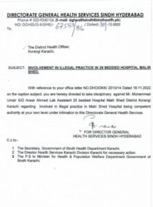 مذید براں اس پر جعلی دستخط سے معاملہ مذید مشکوک ہوگیا ہے۔ ذرائع کے مطابق اس کے ماسٹر مائنڈ محمد عمیر شیخ ہیں جن کے ہمراہ عامر شہزاد سمیت دیگر ملوث ہیں۔ ذرائع کا دعویٰ ہے کہ محمد عمیر شیخ اس سے قبل بھی اس طرح کی سرگرمیوں میں ملوث رہا ہے جس پر ڈائریکٹر جنرل صحت سندھ نے 30 دسمبر 2022 کو ڈی ایچ او کورنگی کو ہدایت کی تھی کہ محمد عمیر شیخ کے خلاف انضباطی کاروائی کی جائے جس پر ڈی ایچ او نے انہیں ریلیو کر دیا تھا لیکن تاحال وہ ضلع کورنگی میں کام کر رہے ہیں جو ڈی جی صحت سندھ کی رٹ کو چیلنچ کرنے کے مترادف ہے۔