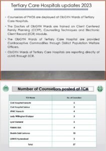سیکرٹری بہبودآبادی سندھ ریحان اقبال بلوچ نے سندھ کے ٹرشری کیئر ہسپتالوں میں حمل کے بعد فیملی پلاننگ اور اسقاط حمل کے بعد فیملی پلاننگ کی اپ ڈیٹس شیئر کیں۔ انہوں نے چیئر کی تعریف کی کہ پاپولیشن ویلفیئر ڈپارٹمنٹ سندھ کے کونسلرز کونسلنگ اور مانع حمل طریقوں کے بارے میں معلومات فراہم کرنے کے لیے ٹرشری کیئر ہسپتالوں کےشعبہ امراض زچہ و بچہ میں تعینات ہیں۔ ان شعبہ جات کے ڈاکٹروں کو کلائنٹ سینٹرڈ فیملی پلاننگ ، کونسلنگ تکنیک اور الیکٹرانک کلائنٹ ریکارڈ ماڈیول پر تربیت دی جاتی ہےجبکہ ٹرشری کیئر ہسپتال کے گائنی وارڈز کو براہ راست ڈسٹرکٹ پاپولیشن ویلفیئر آفیسرز کے ذریعے مانع حمل اشیاء فراہم کی جاتی ہیں۔
