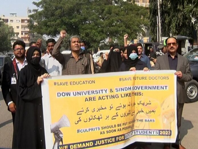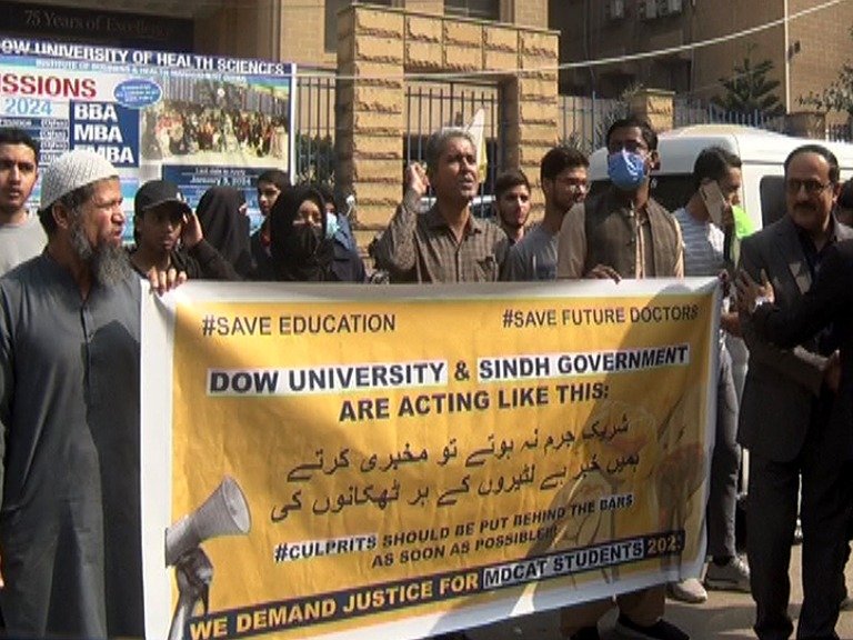 کراچی : ڈاؤ یونیورسٹی آف ہیلتھ سائنسز کے تحت لئے گئے ایم ڈی کیٹ ٹیسٹ کے خلاف امیدواروں نے ہفتے کو احتجاج کیا۔ مظاہرین نے بینرز اورپلے کارڈز اٹھا رکھے تھے جن پر ان کے مطالبات درج تھے۔ امیداروں اور والدین کی جانب سے ڈاؤ یونیورسٹی اور محکمہ صحت سندھ کے خلاف شدید نعرے بازی کی گئی۔