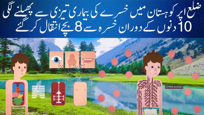 خسرہ جیسی بیماری نے جہاں آج کل ملک کے مختلف حصوں کے ساتھ ساتھ اپر کوہستان کو بھی اپنی لپیٹ میں لیا ہوا ہے. ضلع اپرکوہستان میں 10 دنوں کےدوران خسرہ سے8بچےانتقال کرگئے بچوں کے متاثر ہونے اور انتقال پر ڈی ڈی ایچ او نےڈسٹرک ہیلتھ آفیسر کوخط لکھا کہ اپر کوہستان ضلع میں خسرہ سے اموات ہورہی ہیں متاثر اور انتقال کرنے والے بچوں کی عمریں 11 ماہ سے 12 سال کے درمیان ہیں