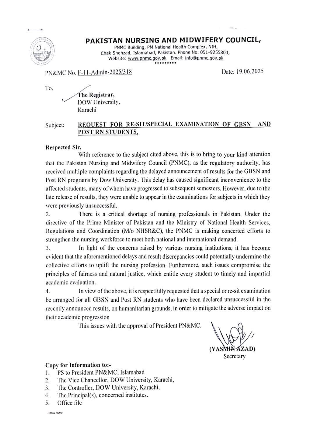 خط کے اختتام پر کہا گیا ہے کہ تمام جی بی ایس این اور پوسٹ آر این طلبا کے لیے جو حالیہ نتائج میں ناکام قرار دیے گئے ہیں، ان کے لیے خصوصی امتحانات “ہمدردانہ بنیادوں” پر رکھے جائیں تاکہ ان کے تعلیمی سفر کو جاری رکھا جا سکے۔ یہ فیصلہ صدر پاکستان نرسنگ اینڈ مڈوائفری کونسل کی منظوری سے جاری کیا گیا ہے اور اس سے سینکڑوں طلبہ کو فائدہ پہنچنے کی امید ہے۔