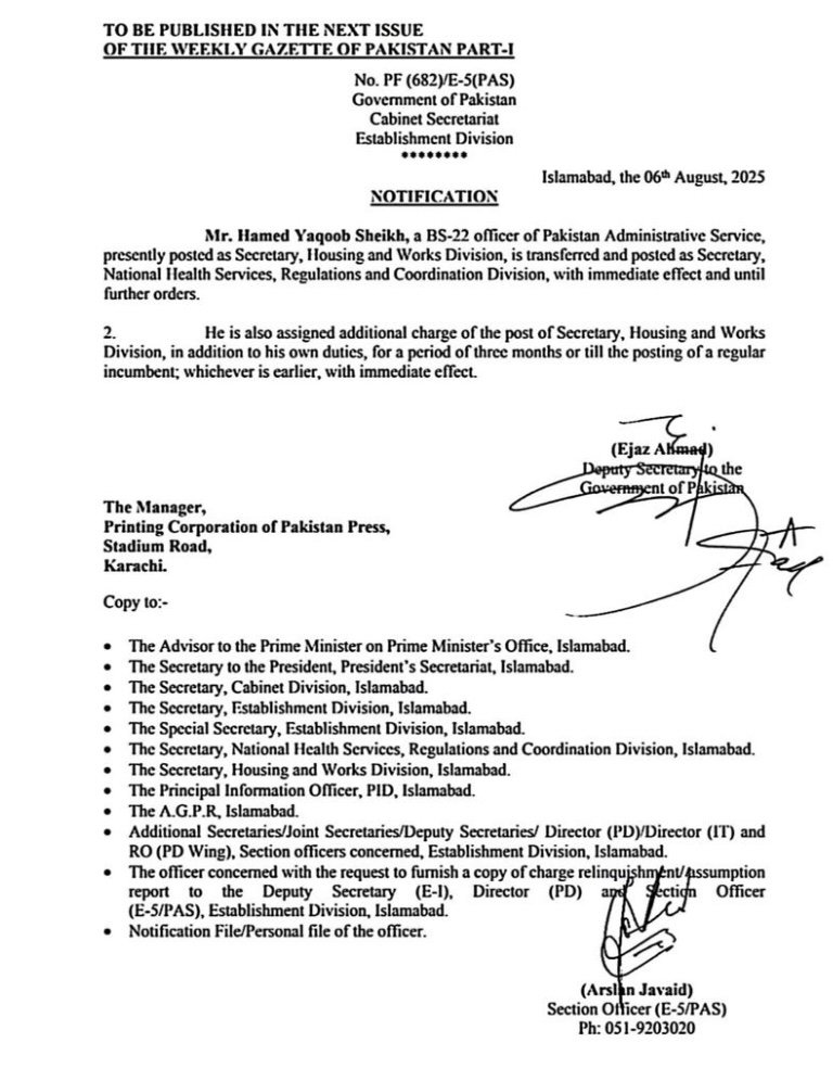 اسلام آباد : سینئر بیوروکریٹ حامد یعقوب شیخ کو وزارت قومی صحت، ریگولیشنز و کوآرڈینیشن (NHSR&C) کا نیا وفاقی سیکریٹری تعینات کر دیا گیا ہے۔ ان کی تقرری کا باضابطہ نوٹیفکیشن اسٹیبلشمنٹ ڈویژن نے جاری کر دیا۔