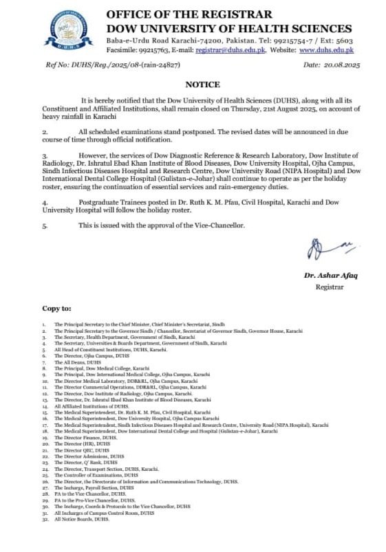 تاہم، ڈاؤ ڈائیگنوسٹک ریفرنس اینڈ ریسرچ لیبارٹری، ڈاؤ انسٹیٹیوٹ آف ریڈیولوجی، ڈاکٹر عشرت العباد خان انسٹیٹیوٹ آف بلڈ ڈیزیز، ڈاؤ یونیورسٹی اسپتال اوجھا کیمپس، سندھ انفیکشس ڈیزیزز اسپتال اینڈ ریسرچ سینٹر (نپا اسپتال)، اور ڈاؤ انٹرنیشنل ڈینٹل کالج اسپتال گلستانِ جوہر میں چھٹی کے باوجود ضروری طبی خدمات اور بارش ایمرجنسی ڈیوٹیز جاری رہیں گی۔