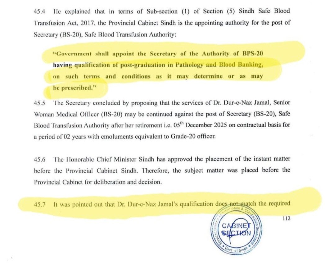 کابینہ کے سامنے پیش کیے گئے سرکاری ایجنڈا پوائنٹس نے پہلی بار باضابطہ تسلیم کیا ہے کہ ڈاکٹر در ناز جمال اس عہدے کے لیے مطلوبہ تعلیمی قابلیت اور قانونی شرائط پر پورا نہیں اترتیں۔ سندھ سیف بلڈ ٹرانسفیوژن ایکٹ 2017 کے مطابق سیکریٹری کے عہدے کے لیے پیتھالوجی یا بلڈ بینکنگ میں پوسٹ گریجویشن ضروری ہے، لیکن کابینہ ایجنڈے میں واضح تحریر ہے کہ ڈاکٹر در ناز جمال کی قابلیت “required criteria” سے مطابقت نہیں رکھتی۔