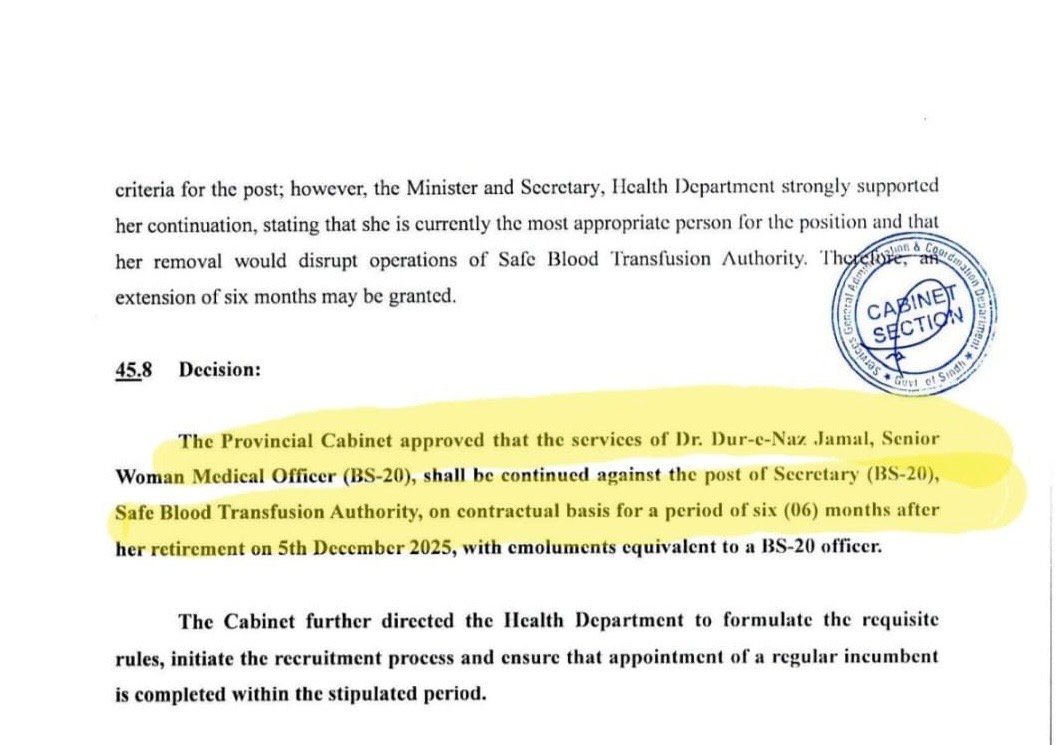 اس نااہلی کے باوجود وزیر صحت اور سیکریٹری صحت نے کابینہ اجلاس میں ڈاکٹر در ناز جمال کے مزید برقرار رہنے کی بھرپور سفارش کی اور متعلقہ حکام کے تمام اعتراضات کو پس پشت ڈال دیا۔ کابینہ ریکارڈ کے مطابق دونوں اعلیٰ حکام نے مؤقف اختیار کیا کہ ڈاکٹر در ناز جمال “اس وقت سب سے مناسب فرد” ہیں، جبکہ محکمہ صحت کے ذرائع ان دعوؤں کو مضحکہ خیز قرار دیتے ہوئے کہتے ہیں کہ گزشتہ برسوں میں سندھ میں ایچ آئی وی، ہیپاٹائٹس بی اور سی کے کیسز میں اضافہ، غیر معیاری خون کی فراہمی اور ریگولیٹری ناکامی انہی کی قیادت کے دوران نمایاں ہوئے۔