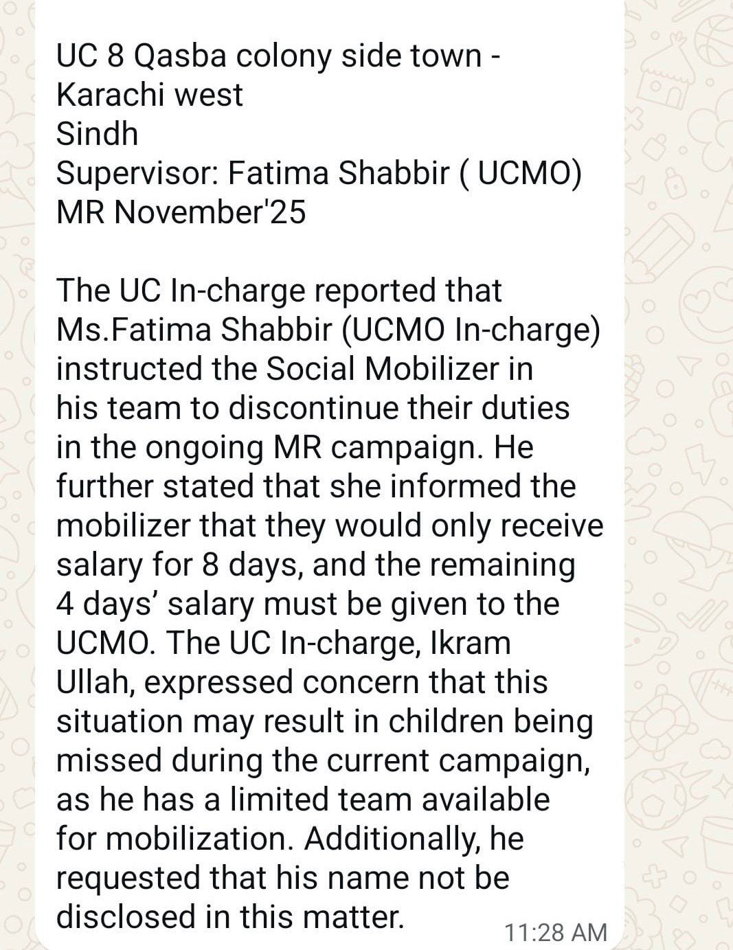 یو سی انچارج اکرام اللہ نے سخت تشویش ظاہر کی ہے کہ ٹیمیں پہلے ہی محدود تھیں، ایسے میں غیرقانونی احکامات نے مہم کو بری طرح متاثر کیا۔ انہوں نے اپنی شناخت ظاہر نہ کرنے کی درخواست بھی کی ہے کیونکہ انہیں خدشہ ہے کہ بدعنوانی کے اس انکشاف کے بعد ان کے خلاف محکمانہ کارروائی کی جا سکتی ہے۔