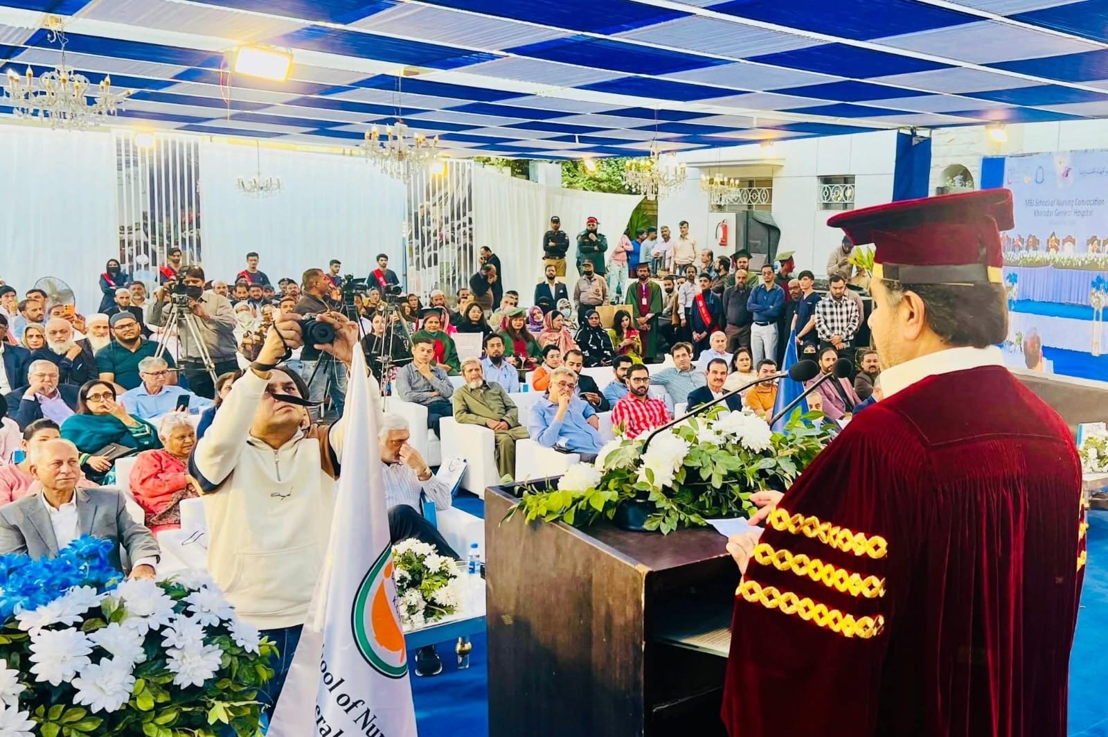 کراچی : کھارادر جنرل ہسپتال کے اسکول آف نرسنگ میں پہلی کانووکیشن کی پروقار تقریب منعقد ہوئی، جس میں صوبائی وزیر سید ناصر حسین شاہ، معزز کمیونٹی رہنماؤں، غیر ملکی سفارتکاروں، صنعتکاروں اور صحت کے ماہرین نے شرکت کی۔ تقریب میں درجنوں گریجویٹس کو ڈگریاں دی گئیں اور انہیں صحت کے شعبے میں اہم کردار ادا کرنے کی ذمہ داری سونپی گئی۔