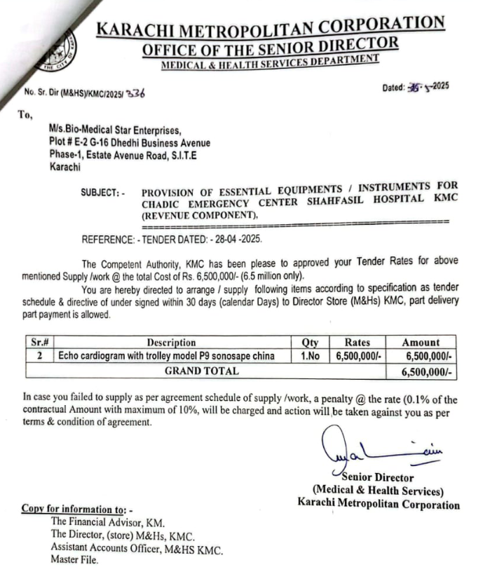 اپریل 2025 میں جاری ہونے والے ٹینڈر ECHO CARDIOGRAM WITH TROLLEY MODEL P9 – SONOSAP CHINA کیلئے تین معروف کمپنیاں سامنے آئیں جن میں بائیومیڈیکل اسٹار انٹرپرائزز، ارتضی عامر ایسوسی ایٹ اور IEEH انٹرپرائزز شامل تھیں۔ ٹینڈر بائیومیڈیکل اسٹار انٹرپرائزز کو دیا گیا اور 65 لاکھ روپے کی ادائیگی آخری تاریخ سے پہلے ہی سرکاری خزانے سے مکمل کر دی گئی۔ تاہم سپلائی کی جانے والی مشین وہ نہیں تھی جس کا ٹینڈر جاری ہوا تھا، بلکہ ایک عام الٹراساؤنڈ مشین تھی جو عموماً میٹرنٹی ہومز میں استعمال ہوتی ہے۔