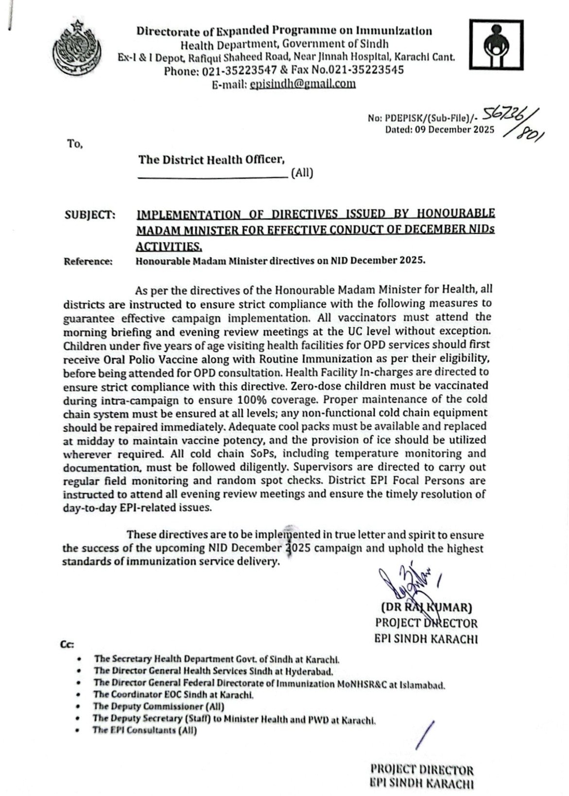 مزید احکامات کے مطابق سپروائزرز کو فیلڈ مانیٹرنگ اور اچانک اسپارٹ چیک کرنے کی سختی سے ہدایت کی گئی ہے۔ تمام ڈسٹرکٹ EPI فوکل پرسنز ہر شام کی ریویو میٹنگ میں شرکت یقینی بنائیں اور روزمرہ مسائل موقع پر حل کریں۔ یہ مراسلہ سیکریٹری صحت، ڈی جی ہیلتھ سندھ، فیڈرل ڈائریکٹوریٹ امیونائزیشن، ای او سی سندھ، تمام ڈپٹی کمشنرز اور دیگر متعلقہ حکام کو بھی ارسال کیا گیا ہے۔