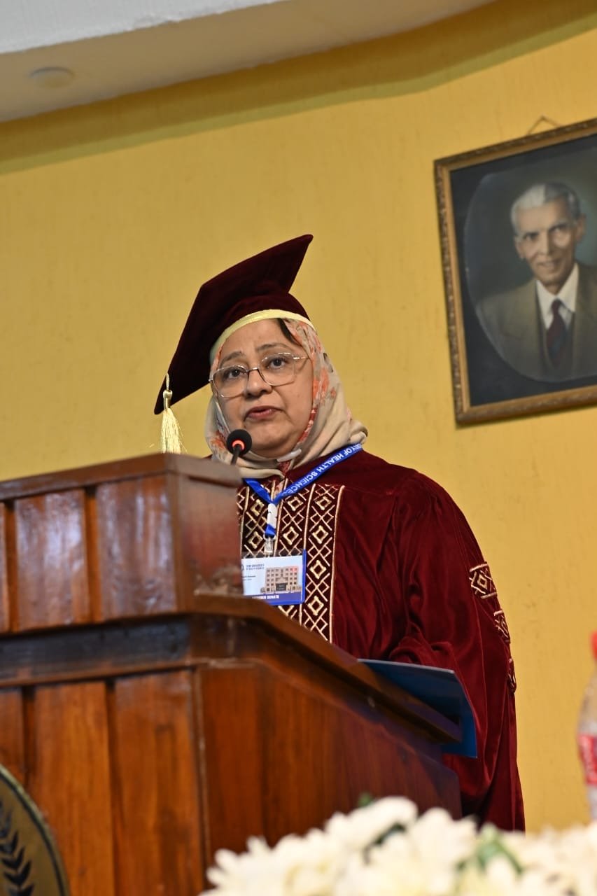 اس سے قبل وائس چانسلر پروفیسر نازلی حسین نے سالانہ کارکردگی رپورٹ پیش کی، جس میں 2024–25 کے دوران تعلیمی ترقی، تحقیقی کارکردگی اور صحت کی خدمات میں نمایاں پیش رفت کو اجاگر کیا گیا۔ رپورٹ کے مطابق یونیورسٹی نے متعدد نئے پروگرامز متعارف کرائے جن میں ایم ایس مینجمنٹ سائنسز، ایم فل میڈیکل ٹیکنالوجی، پی ایچ ڈی فارماسیوٹیکل کیمسٹری اور پی ایچ ڈی فزیکل تھراپی شامل ہیں۔