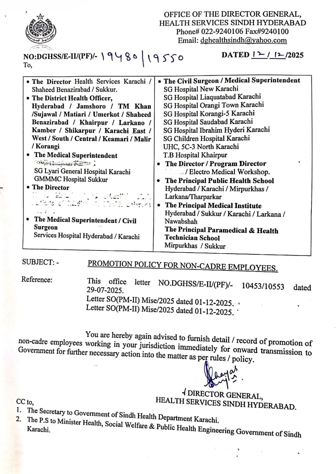 کراچی/حیدرآباد : محکمہ صحت سندھ میں برسوں سے جاری نان کیڈر ملازمین کی مبینہ غیر قانونی ترقیوں پر اب گھیرا تنگ کر دیا گیا ہے۔ ڈائریکٹر جنرل ہیلتھ سروسز سندھ نے صوبے بھر کے ڈویژنز کے ڈائریکٹرز، ڈسٹرکٹ ہیلتھ افسران اور میڈیکل سپرنٹنڈنٹس کو آخری وارننگ دیتے ہوئے نان کیڈر ترقیوں کا مکمل ریکارڈ فوری طور پر فراہم کرنے کا حکم دے دیا ہے، جس کے بعد غیر قانونی طور پر ترقی پانے والے ملازمین کی شامت آنے کے واضح آثار نظر آ رہے ہیں۔