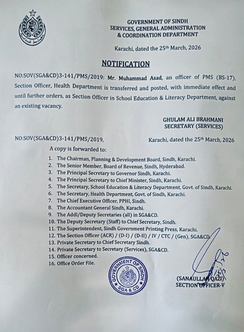 کراچی : حکومتِ سندھ نے محکمہ صحت میں مبینہ بدعنوانیوں کے خاتمے کی جانب ایک اہم قدم اٹھاتے ہوئے سیکشن آفیسر ڈاکٹر محمد اسد کھتری کو فوری طور پر تبدیل کر دیا ہے۔ سروسز، جنرل ایڈمنسٹریشن اینڈ کوآرڈینیشن ڈیپارٹمنٹ کی جانب سے جاری نوٹیفکیشن کے مطابق محمد اسد (پی ایم ایس، گریڈ 17) کو ہیلتھ ڈیپارٹمنٹ سے ہٹا کر اسکول ایجوکیشن اینڈ لٹریسی ڈیپارٹمنٹ میں بطور سیکشن آفیسر تعینات کر دیا گیا ہے۔